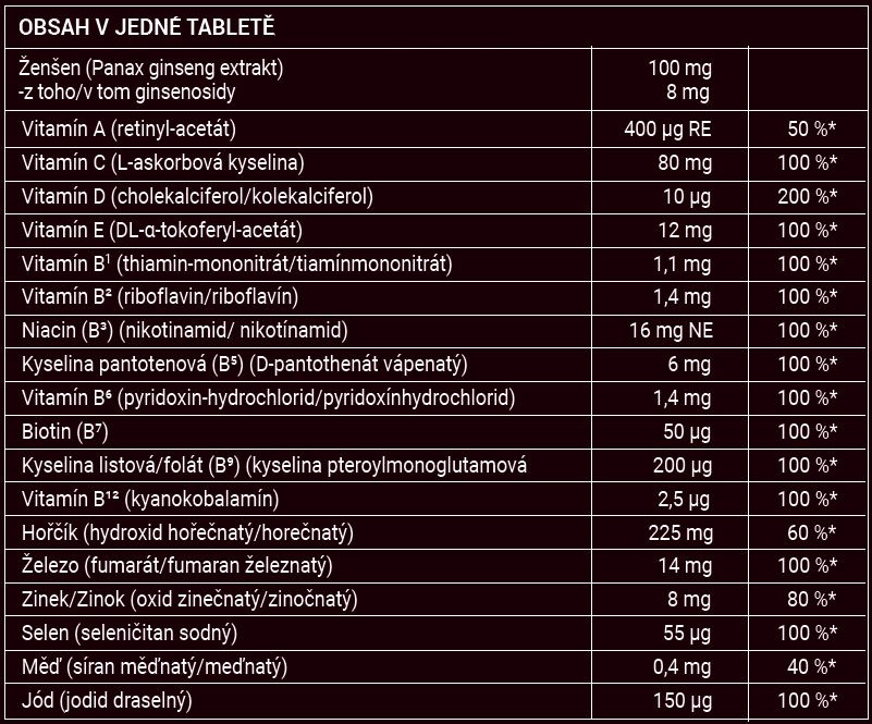 Optimální kombinace vitamínů, minerálů, antioxidantů a energizujícího extraktu ženšenu
